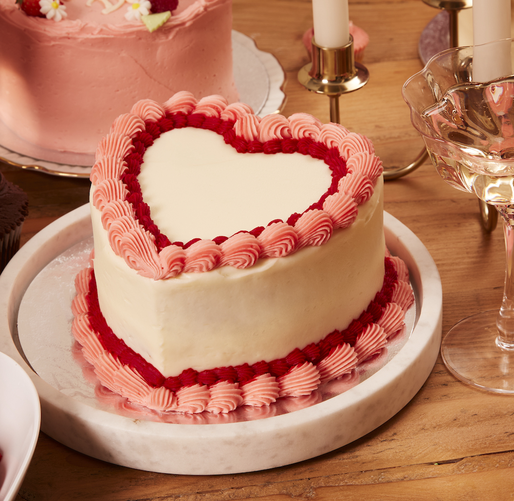 Vintage lovers will adore the Vintage Blush Heart Cake, featuring vanilla sponge and crisp white frosting with pink and red shell piping, while the bold Ruby Heart Cake makes a statement with vibrant red vanilla frosting and dramatic piping. The Snowy Heart Cake, a red velvet favourite finished with cream cheese frosting and oversized shell piping, offers a beautifully classic finish.