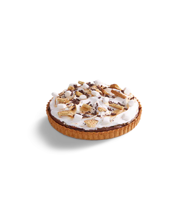 A rich, silky hot chocolate filling in a 8 inch shortcrust pastry base, topped with fluffy meringue, gooey marshmallows, chocolate curls and chunks of crunchy biscuits.