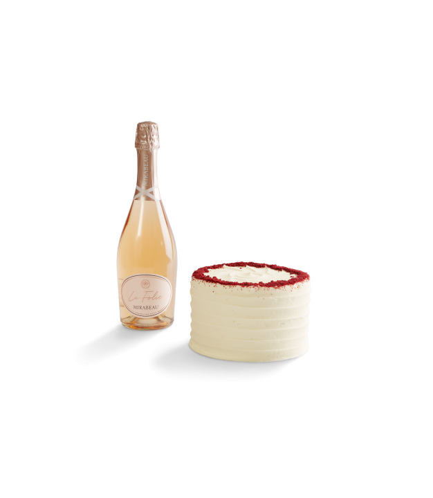 This hamper includes a bottle of Mirabeau La Folie Sparkling Rosé and our customers’ all-time favourite 6" Red Velvet Cake. Deep red vanilla cake with a light taste of chocolate, topped with cream cheese frosting. This decadent layer cake is sure to please.