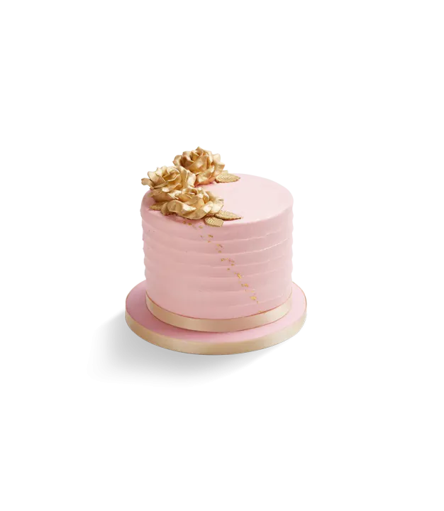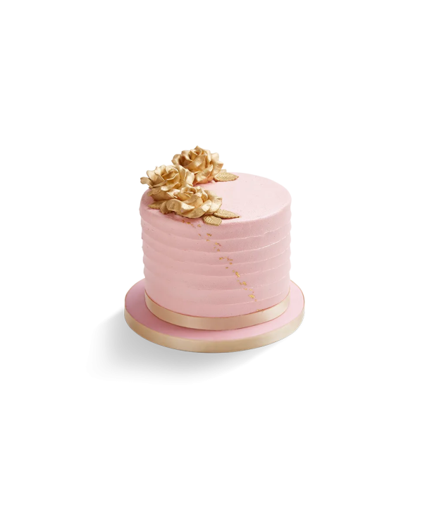 Pretty in pink and suitable for any occasion, our new Rose Collection Vanilla Cake has 4 layers of fluffy Vanilla or decadent Chocolate sponge, finished with soft pink Vanilla buttercream and topped with hand-made golden sugar paste roses and a hint of delicately trailing gold leaf.