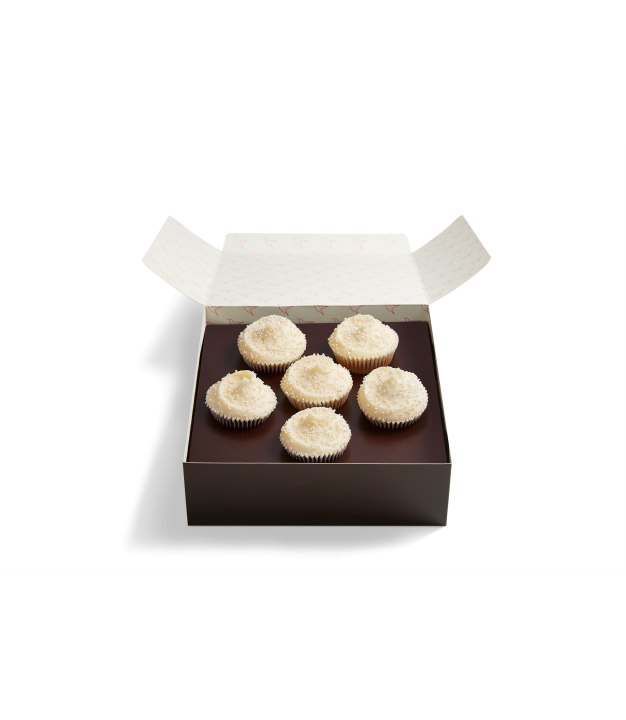 This classic cupcake box is perfect for any occasion. Containing 2 Vanilla, 2 Chocolate and 2 Red Velvet cupcakes with our signature frosting swirl and white pearlised nonpareil sprinkles. Pair with our Rose Collection Vanilla Cake for an elegant dessert display.