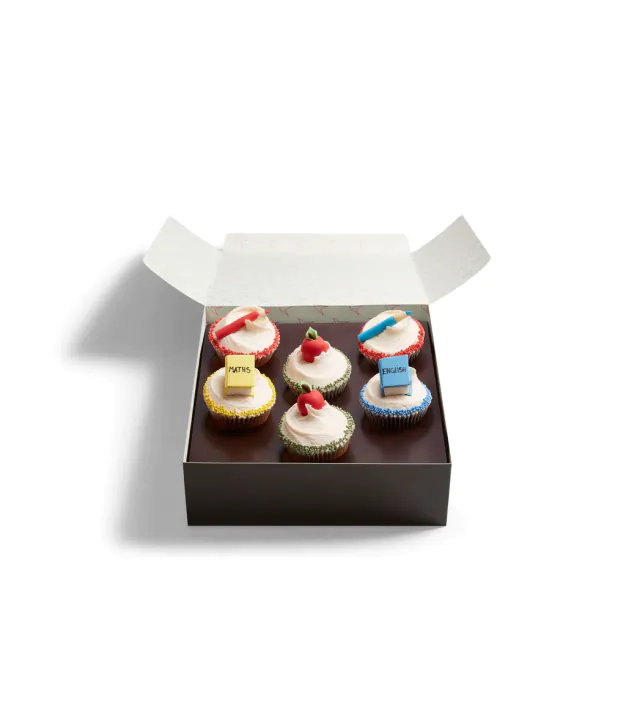 This colourful School Days Selection Box contains 3 Vanilla and 3 Chocolate cupcakes, frosted with fluffy Vanilla buttercream and finished with nonpareil sprinkles and hand-made sugar paste pencils, books, and an apple for the teacher to finish off this assignment! It gets an A+ from us!