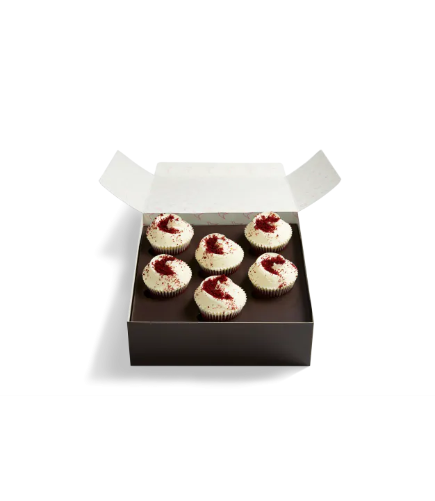 This gourmet cupcake selection box opens to reveal six Red Velvet sponges topped with decadent cream cheese frosting and a generous sprinkling of fine Red Velvet crumbs.