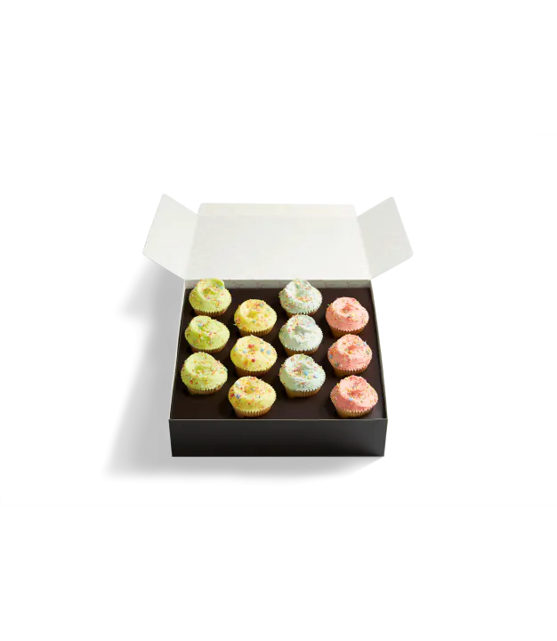Twelve freshly baked airy Vanilla cupcakes topped with generous quantities of fluffy vanilla buttercream frosting in an array of bright colours make this the ideal cupcake selection box for sharing.