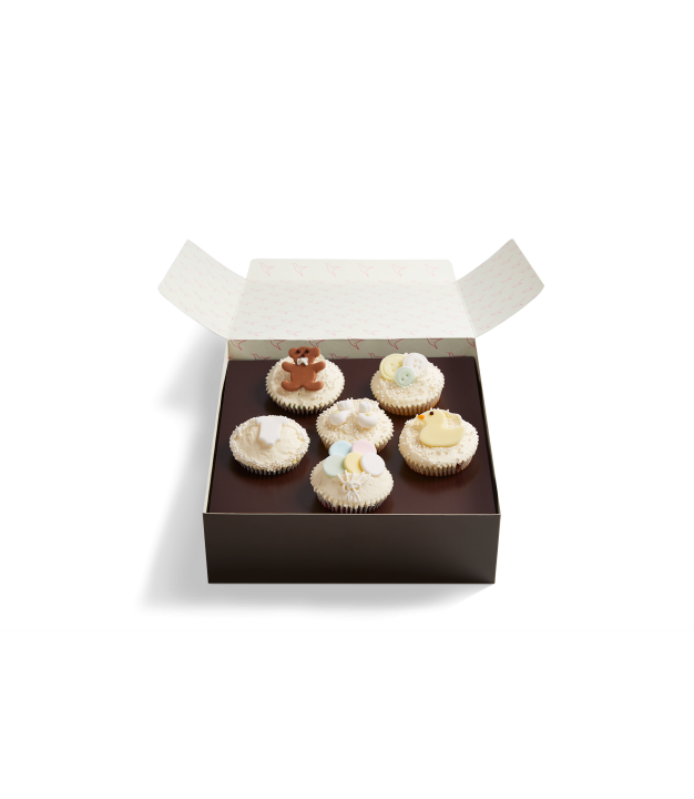 Hello little one! Welcome the new arrival with this adorable white frosted gift box of Hummingbird Bakery cupcakes topped with cute as a button baby-themed fondant designs.